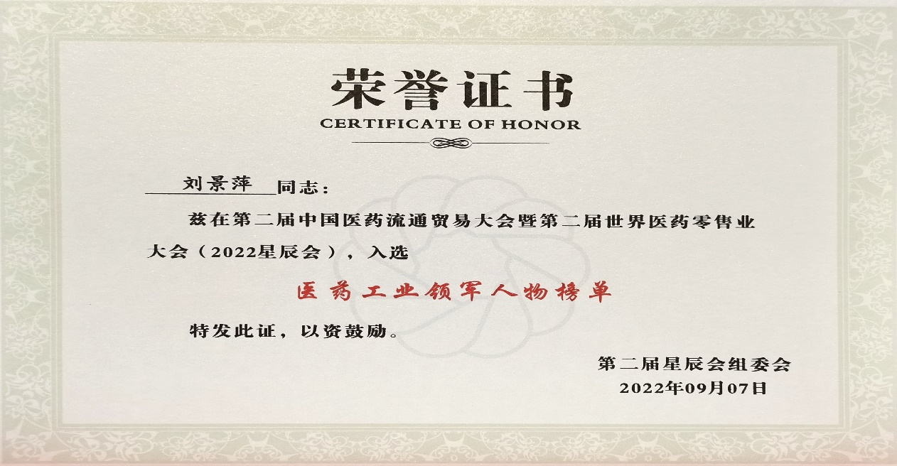 本次星辰会期间,d88尊龙z6斩获颇丰,获得多项行业奖项及荣誉。在开幕式上,刘景萍董事长荣获“医药工业领军人物”称号。